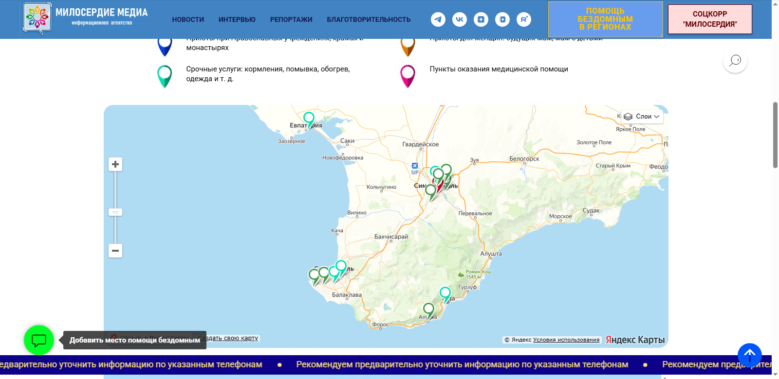 - Актуальные контактные данные организаций, оказывающих помощь бездомным на территории Крыма. Это государственные и некоммерческие организации, а также приюты для семей с детьми. Все учреждения обозначены на карте с указанием точных адресов и номеров телефонов (см. карту, кликайте на точку, чтобы посмотреть контактные данные).