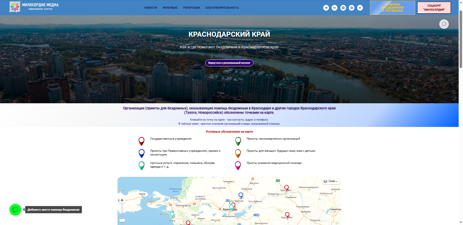 - Актуальные контактные данные организаций, оказывающих помощь бездомным в Краснодарском крае. Это государственные и некоммерческие организации, а также приюты для семей с детьми. Все учреждения обозначены на карте с указанием точных адресов и номеров телефонов (см. карту, кликайте на точку, чтобы посмотреть контактные данные).