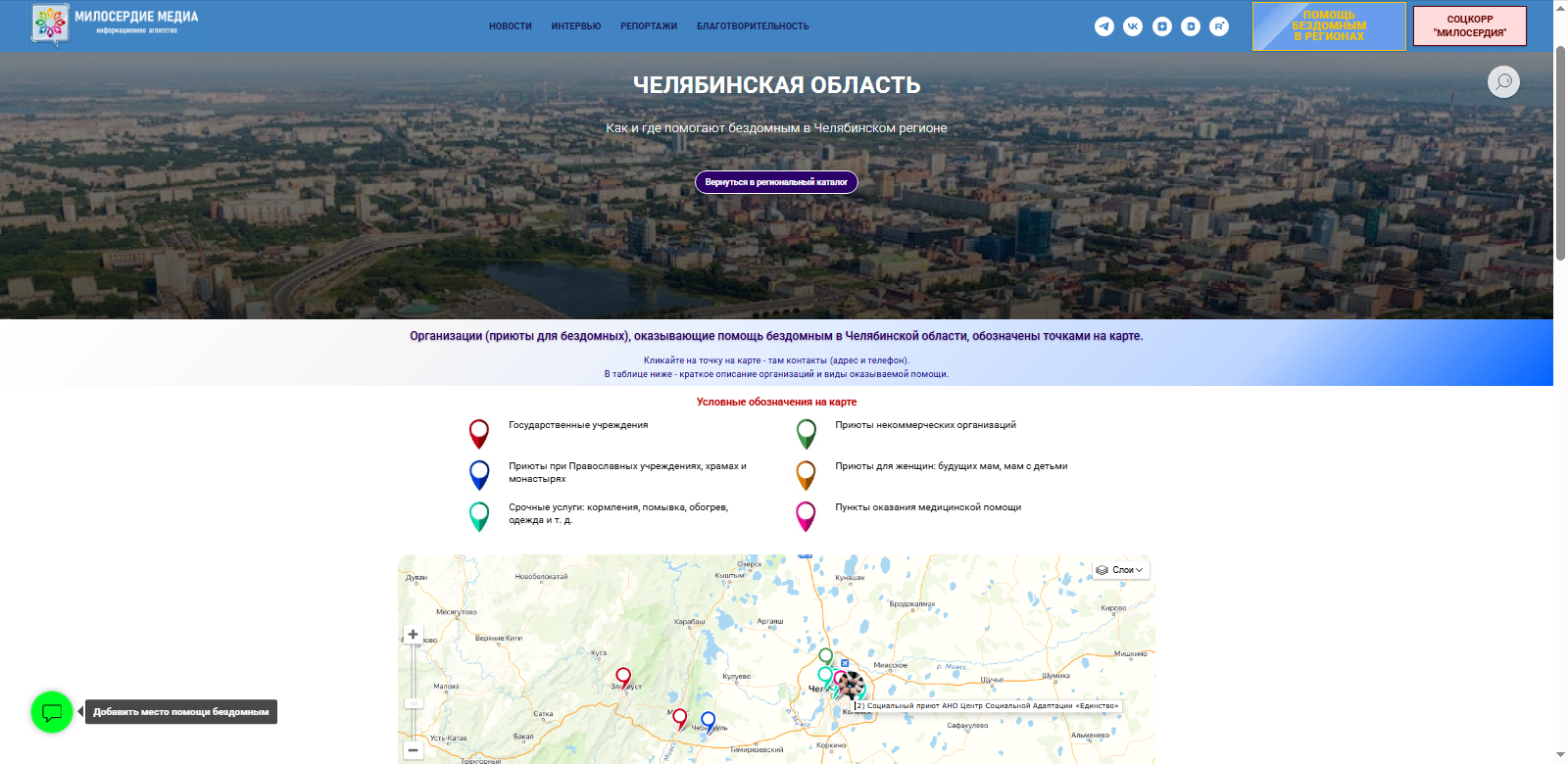 Уникальный проект ИА "МилосердиеМедиа" - каталог организаций, оказывающих помощь людям, попавшим в трудную жизненную ситуацию, в разных регионах Российской Федерации, постепенно расширяется и дополняется. На данный момент актуализирована информация ещё по одному региону - Челябинской области. На странице вы найдёте: