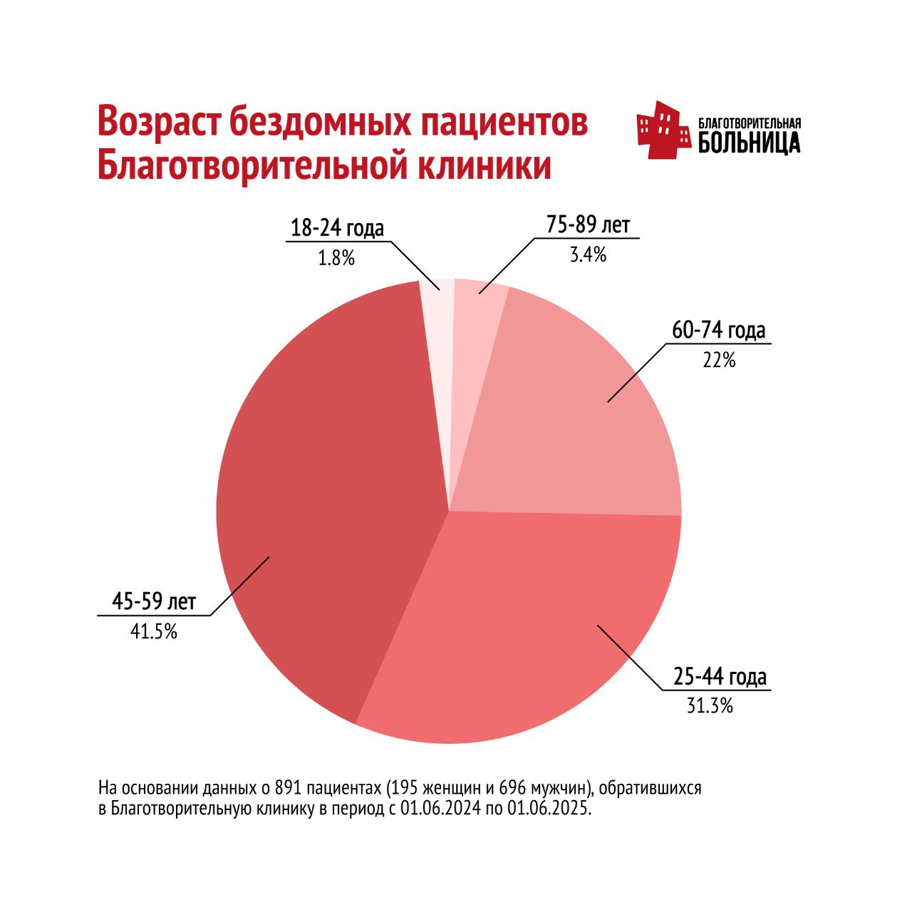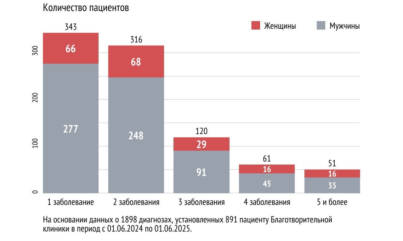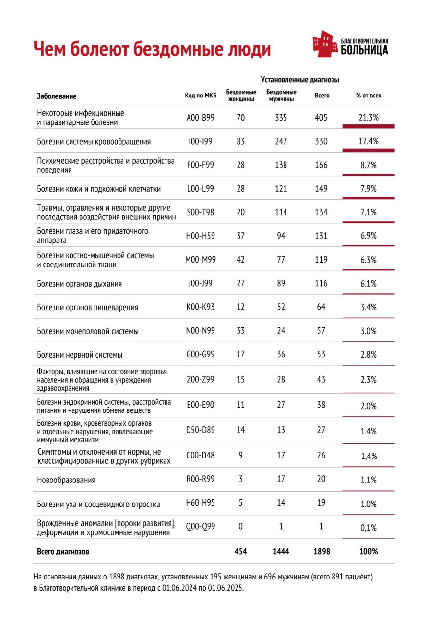 В "Благотворительной больнице" г. Санкт-Петербурга проанализировали* данные о заболеваемости 891 бездомного пациента (195 женщин и 696 мужчин). Эти люди обратились за помощью в клинику для бездомных, беженцев, людей без документов и гражданства с июня 2024 по июнь 2025 г.